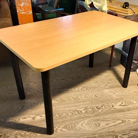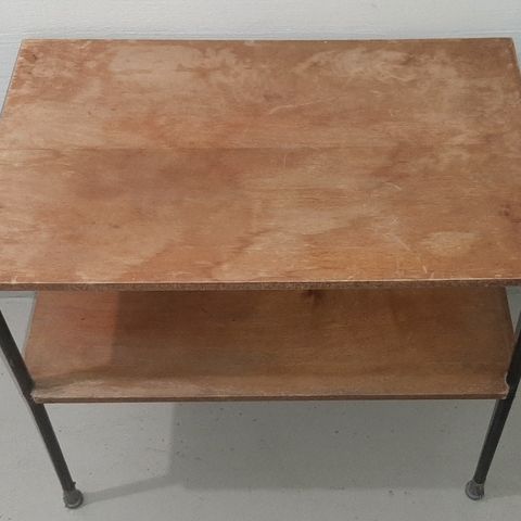 Runko metallia, taso huonekalulevyä. Pari käytön jälkeä pinnalla, näkyy kuvissa. Muuten tukeva ja hyvässä kunnossa.