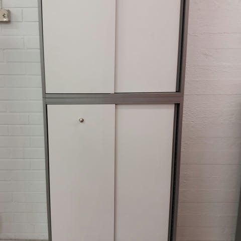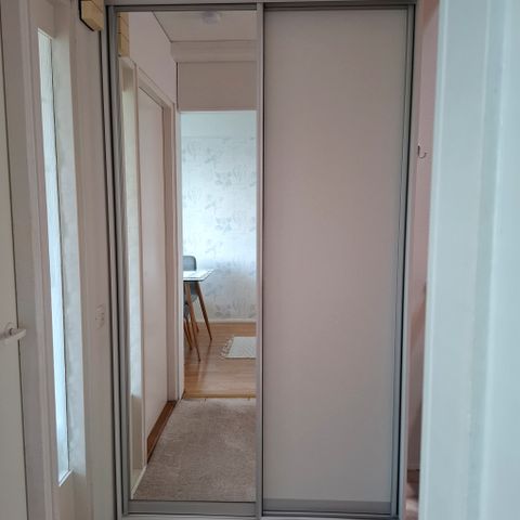 Nyt hyvään hintaan myymälän mallikappaleena ollut liukuovikomero. Mustat alumiinikehykset ja valkoinen lasi ovissa. Sisällä tankoja, hyllyjä, ulosvedettävä kenkäteline ja laatikoita. Hyvässä kunnossa muuten, mutta toisen oven alareunassa pieni halkeama.