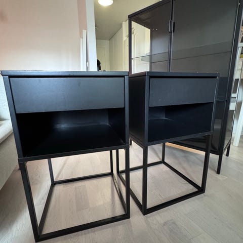 Mustat Ikean Vikhammer yöpöydät myyntiin uusien tieltä pois! Yleisilme siisti, toki ajan saatossa tullut muutama kuluma mutta ei pistä silmään. Ylhäällä vetolaatikko, jonka alapuolella säilytyslokero. Lisätietoja kysymällä! (koiratalous)