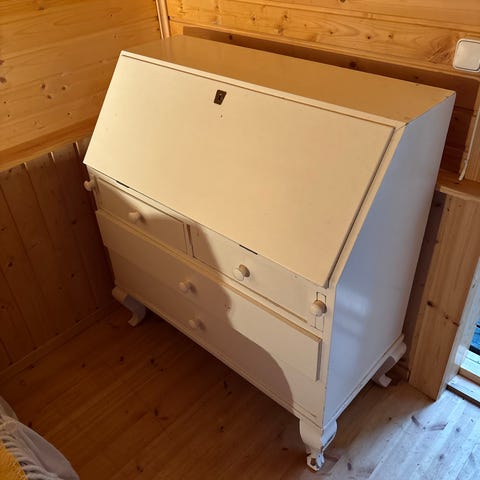 Kirjoituslipasto. Kaksi pientä ja kaksi isompaa vetolaatikkoa. Sisäpuolella paljon jälkiä lasten askasteluista.
