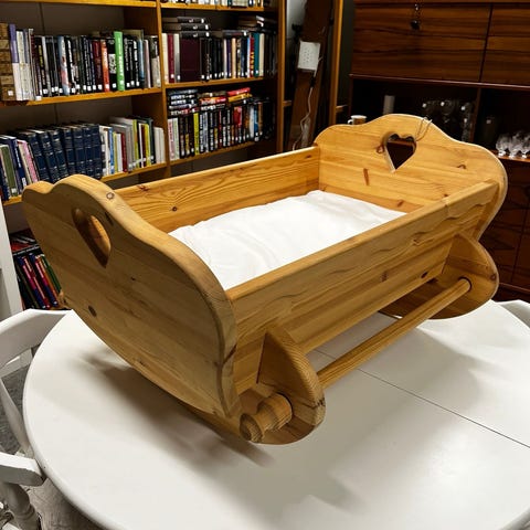 Uusi yhdet päikkärit nukuttu kaunis koivupuinen kuultolakattu kehto 67x32cm patjalla.