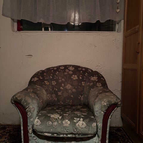 Käytössä ollut nojatuoli, jolle ei enää tarvetta. Sisämekanismi toimii moitteettomasti. Pientä jälkeä kankaassa, mutta ei suurempia.