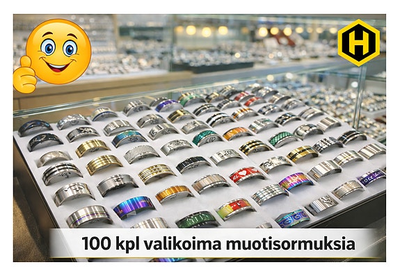 Hakusanat: Sormukset, Muotisormus, Naisten sormus, Miesten sormus, Juhlasormus, Sormussetti, Halkaisija 17-21mm, 100 sormusta, Sormuspaketti
