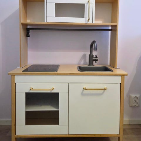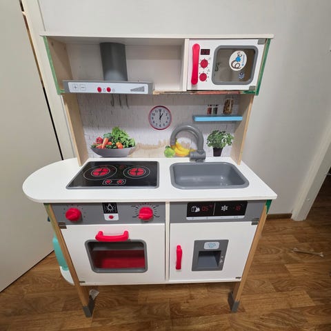 Tästä pukin konttiin nuorelle kokille valmis IKEA-keittiö sekä runsaasti kattiloita, astioita ja leikkiruokia (Ikeaa, Plastoa, jne). Liesien valot toimivat. Alempi pleksi hyvässä kunnossa, ylemmässä pleksissä pientä käytön jälkeä, joka ei kuitenkaan haittaa leikkejä.