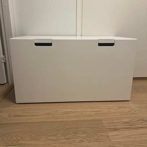 IKEA lasten säilytyslaatikko, jossa vaaleanpunainen etuosa ja valkoinen kansi. Säilytyslaatikko on tarkoitettu lasten tavaroiden järjestämiseen. Laatikossa on käytön jälkiä, mukaan lukien pieniä naarmuja kannessa.