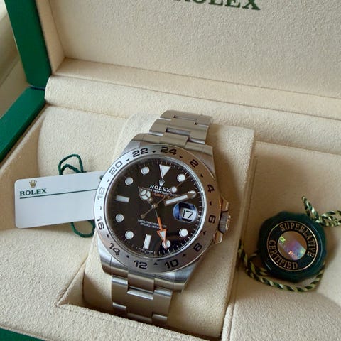 Tarjolle ikäisekseen siistissä kunnossa ja kattavalla setillä varustettu Exp II ”Polar”. Upealla valkoisella taululla jossa päivyri sekä GMT -kaksoisaika. Teräksinen kuori niinikään teräksisellä kehällä yhdistettynä mukavan tuntuiseen teräsrannekkeeseen. Koneistona toimii Rolex 3185 -automaatti. Kelloa seuraa molemmat laatikot, manuaalit, takuutodistus sekä tuoreet käynti ja tiiviystesti tulokset. Kellon takuutodistus on leimattu 3/1998. Kello tarkastettu 12.12.2025 kellosepän toimesta ja siitä käynti sekä tiiviystesti tulokset, ei välitöntä huollon tarvetta. Tästä edullisesti upea Polar kohti uusia seikkailuja.