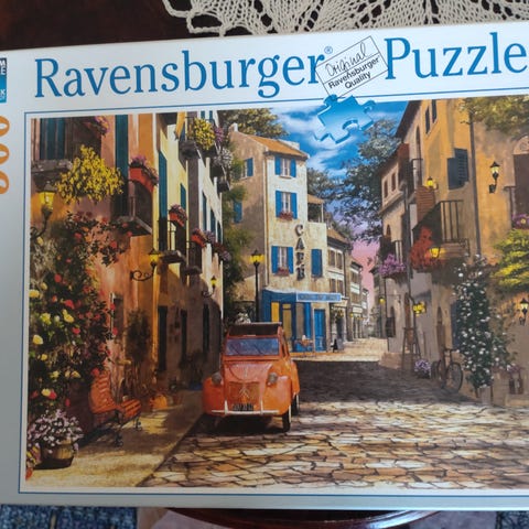 Kerran koottu Ravensburger 500 palan palapeli. Kaikki palat siististi pussitettu alkuperäiseen pussiin.