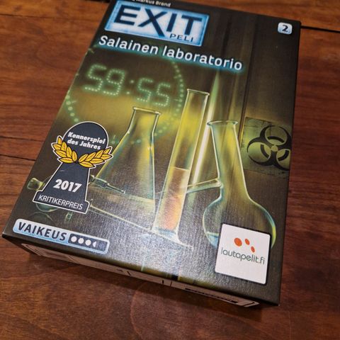 HUOM! Laatikossa lukee, että pelin voi pelata vain kerran. Oikeasti voi toki pelata uudestaankin, mutta pelin osat eivät enää ole uudenveroisessa kunnossa, koska pelin ideaan kuuluu taitella, leikellä, käännellä ja väännellä osia (en muista mitä juuri tässä pelissä piti tehdä, kun ollaan pelattu useita sarjan pelejä). Yksi pelin korteista on korvattu itse tehdyllä samanmuotoisella.