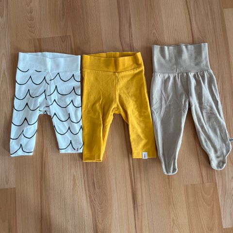3 keltaista ja 2 harmaata Reima-housua, 50-56 kk