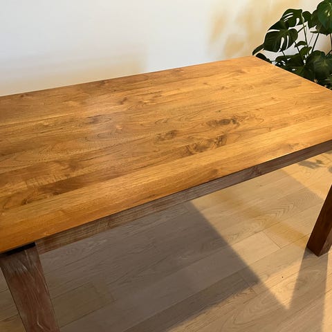 Tiikkinen ruokapöytä, jossa valkoinen kansi ja tummat jalat. Pöydässä on säilytyslaatikot ja se sopii ruokailuun tai työskentelyyn.