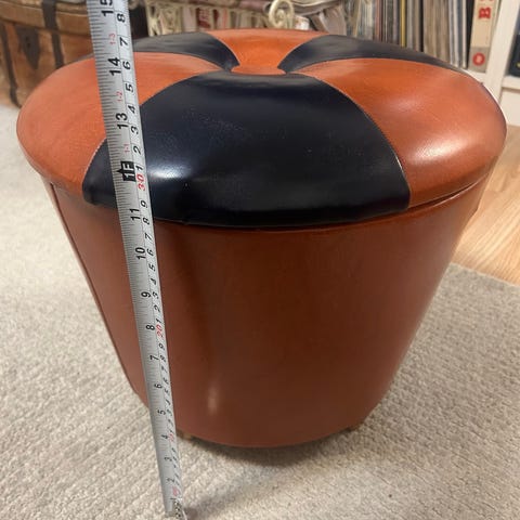 Alkuperäinen, keinonahkainen jakkara. Pieneen säilytykseen, rahiksi. Kestää kevyen istujan. Halkaisija 38cm, korkeus 31 cm.