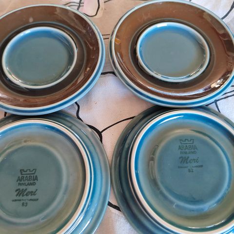 Ulla Procopén suunnittelemat Arabian Meri-lautaset 2 kpl yhteishintaan 20e. Halkaisijat 20,3 cm. Jonkin verran käytön jälkiä, ei lohkeamia. Vintage .
