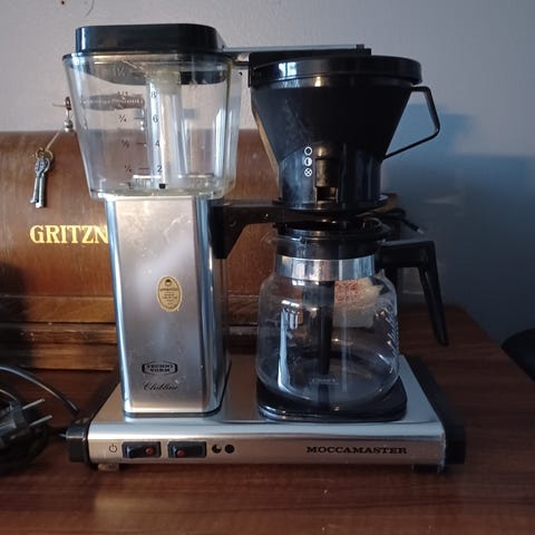 Moccamaster kahvinkeitin joka keittää kahvin suoraan termokseen. Termos on pidetty puhtaana ja sekä termos että keitin on asianmukaisesti puhdistettu ennen myyntiin laittoa.