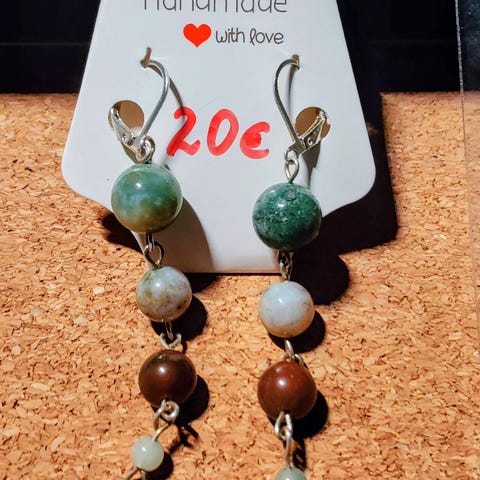 Handmade korvakorut, joissa on keinotekoiset jadekivet vesimeloni ja pinkki kvartsi. Korvakoruijen pituus on noin 6 cm. Voit katsoa Instagramissa @bijouterie_stones