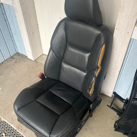 Volvon kuskin nahkajakkara kiskoilla ja turvavyön soljella... Kulumaa näkyvissä mutta suurempaa repeämää ei ole, keslellä istuinosassa pieni jälki muuten hyvässä kunnossa