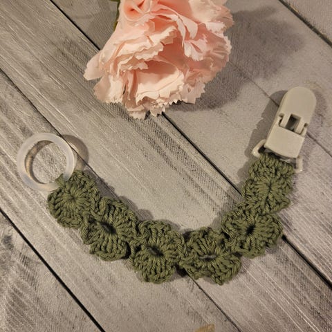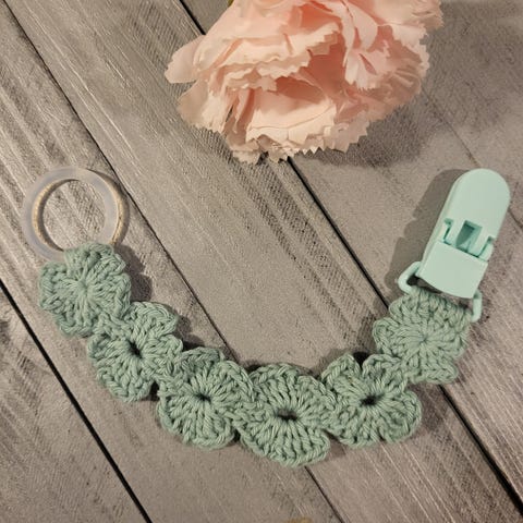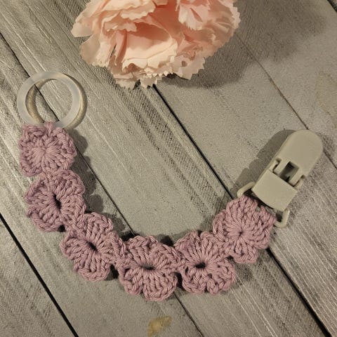 Suloinen ja laadukkaasti käsin virkattu tuttinauha, pituus noin 21 cm.