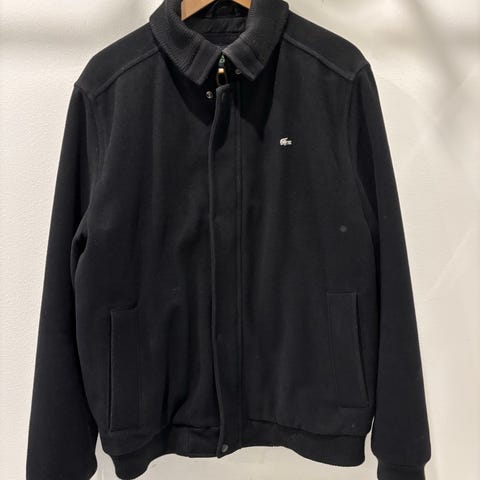 Lacosten tummansininen kangastakki, vuorin välissä ohut polyesteritäyte. Toisen taskun nappi irronnut mutta varanappi tallessa.