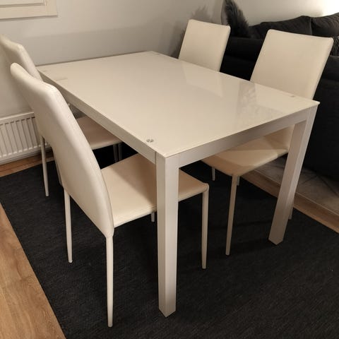 Myynnissä siistikuntoinen ja moderni musta ruokailuryhmä, johon kuuluu lasikantinen pöytä sekä neljä keinonahkaista tuolia.