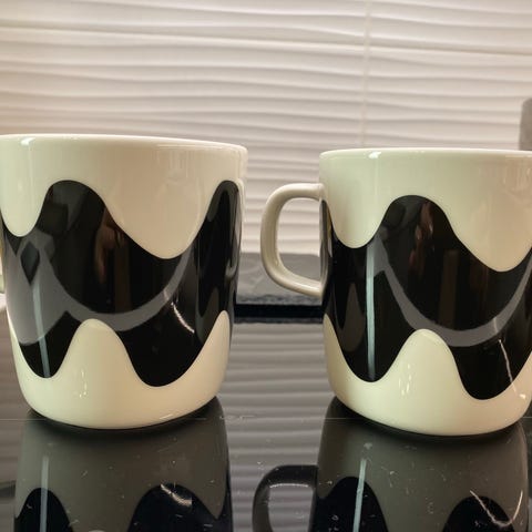 Marimekko Lokki mukit, 4 kappaletta, vaaleanpunainen ja valkoinen väri, valmistettu keraamisesta materiaalista. Sopivat käytettäväksi juomien tarjoiluun. 23€ kpl, kaikki neljä 80€