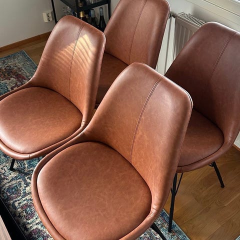 4kpl tummansinisiä samettisia tuoleja. Mustat metallijalat. Hyvä käytetty kunto, materiaalissa (istuimet ja selkänojan sisäpuoli) jonkin verran kulumaa