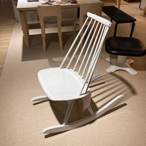 Valkoinen Artekin Mademoiselle keinutuoli, istuinkorkeus 45 cm. Hyvin vähällä käytöllä ollut ja kunto muuten hyvä, mutta istuinosassa on kaksi pitkää painaumaa/naarmua, joista toisessa hieman maali irronnut ja ne näkyvät kuvassa.
