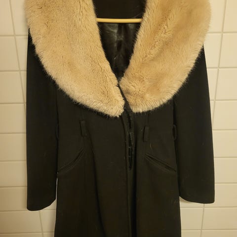 Miss Selfridge pitkä takki mustassa värissä, koko M. Takissa on vyö ja turkiskaulus.