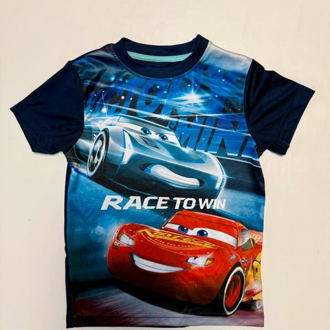 Uusi sininen pitkähihainen paita, käsinpainettu auto kuva ja isoveli teksti.