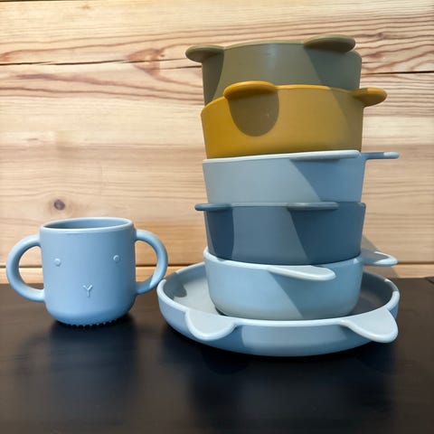 Vauvan ensimuki, -lautanen ja kippo. Nämä eivät meillä ehtineet käyttöön kuin kerran tai kaksi. Koiratalous