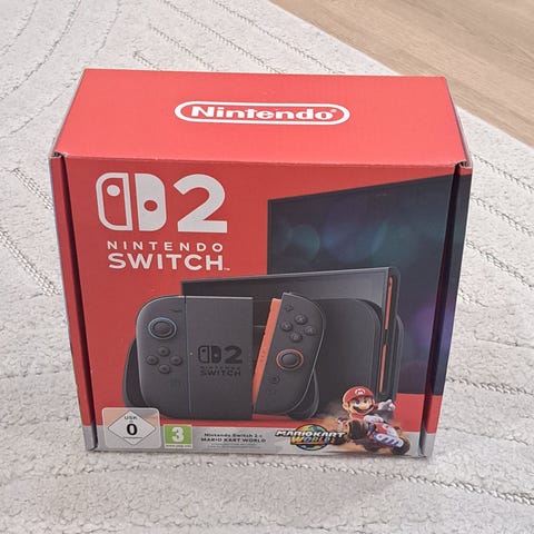Nintendo Switch 2 konsoli, sisältää konsolin, Joy-Con-ohjaimet, telakan ja alkuperäisen pakkauksen.