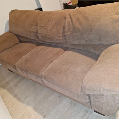 Täysin ehjä siistikuntoinen vaaleanruskea sävyinen sohva. Verhoilu on kestävää mokkaa muistuttavaa kangasta. Kiinteät ryhdikkäät päälliset. Pohjakankaassa alkuperäinen vetoketju. Ei eläintalous. Tuontimahdollisuus sovittaessa erikseen!