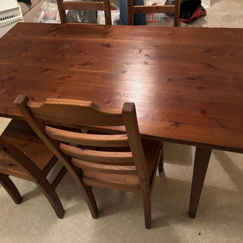 Annetaan puinen ruokapöytä ja neljä tuolia. Kaksi tuoleista on tukevia, kaksi heiluu. Heiluvissa löysät liitokset, ja ainakin toisessa 2 pultin paikkaa haljennut (2. Kuva) eli kiristäminen ei korjaa heilumista.