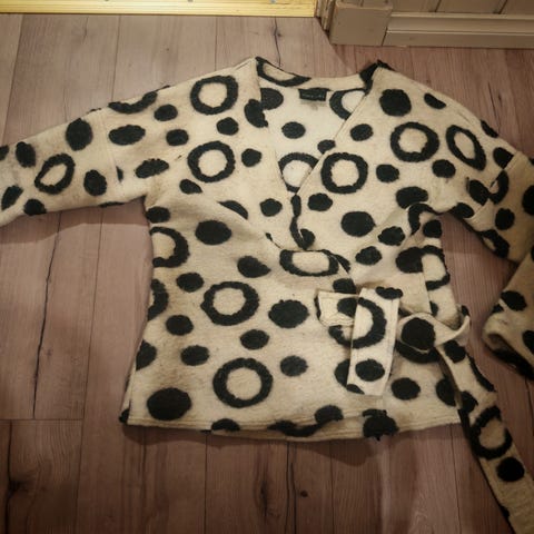 Olars Ullan luonnonvalkoinen S-kokoinen neuletakki. Materiaalina 100% vintagefarkuista kierrätetty puuvilla. Vähän käytetty.