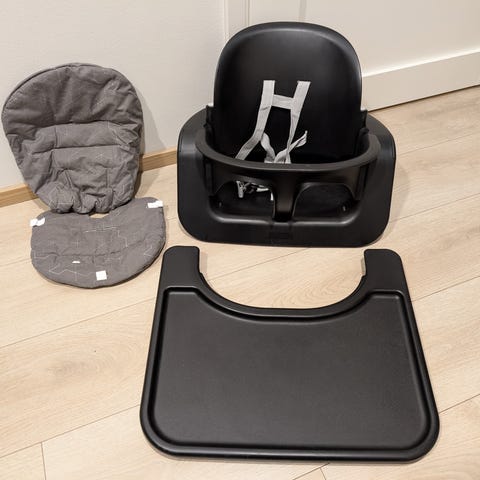 Ehjä, siistikuntoinen (kolmella lapsella käytetty) babyset ja tarjotin Stokke steps tuoliin.
