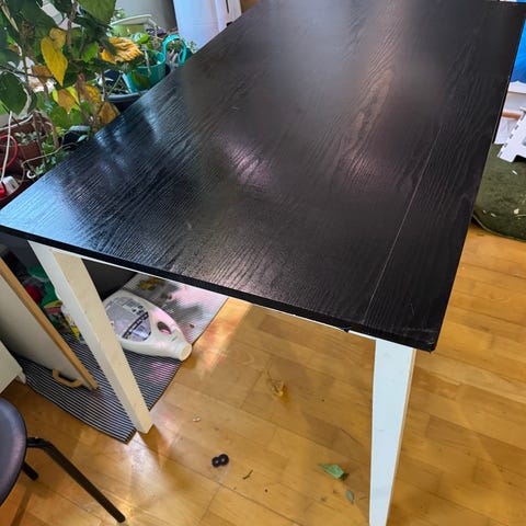 Annetaan kuvanmukainen pöytä. Pinnassa kuluma, muuten ehjä ja tukeva. Jatkopala on 49cm pitkä.