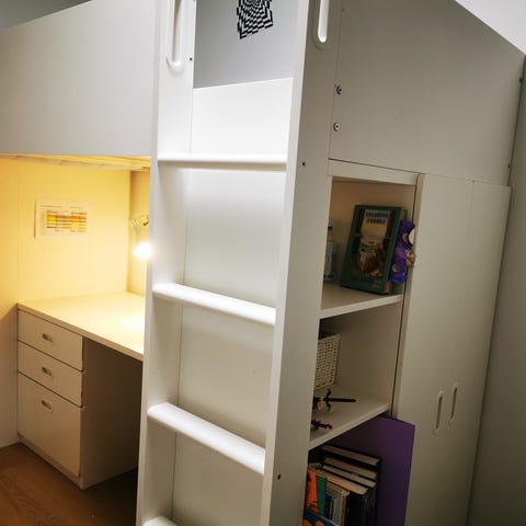 Sängyn alle jää tila, jota voi hyödyntää esimerkiksi leikkitilana mukaan tulevien IKEA-verhojen avulla [ https://www.ikea.com/fi/fi/p/kura-vuodeverho-monivaerinen-elaeimiae-savannilla-90603218/ ; ei sama kuosi, vaan tori / kioski-aiheinen, ks kuvat ].