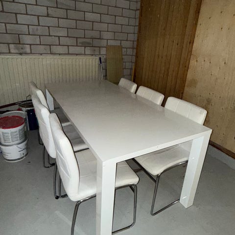 Tuolit ovat hyvässä kunnossa. Pöydän pinnassa on hieman käytön jälkiä, mutta yleisilme on siisti ja ryhmä on erittäin tukeva.