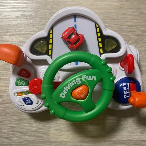 Leluratti, jossa valo- ja äänitoiminnot. Ratin voi myös kiinnittää rattaisiin matkustajaa viihdyttämään.