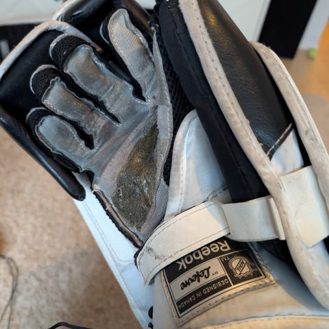 Maalivahdin kilpi. Koko Sr. Levy ehjä. Hanskasta pinta kulunut puhki, mutta ei läpi. Käytön jälkiä ja kulumista löytyy mutta kunto hyvä. Pelattu höntsälätkää. Koiratalous. MMM
