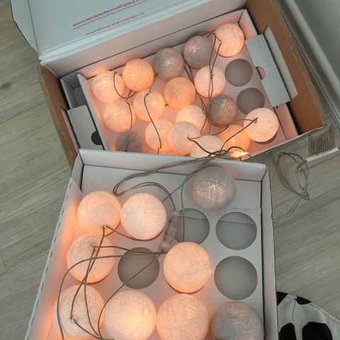 24 valkoista palloa, myyjän mukaan oli uudet/uudenveroiset. Kaikki toimii moittetta, valot ovat alkuperäisessä pakkauksessa, ovh n. 40-50 euron luokkaa. Itse päädyimme kuitenkin värilliseen teemaan, siksi nämä jäivät käyttämättä.