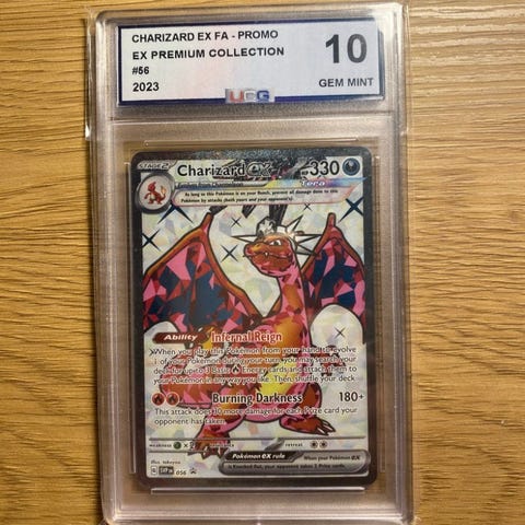 Pokémon Charizard GX keräilykortti, suojakuoressa. Kortti on arvioitu ja luokiteltu kuntoon 9 asteikolla 1-10.