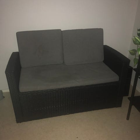 Ulkorahi, jossa musta metallirunko ja köysimateriaali. Sopii ulkokäyttöön, tarjoaa istumapaikan kahdelle henkilölle.