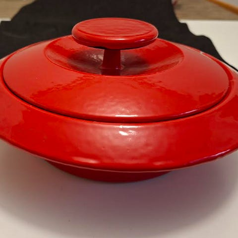 Pata on loistava käyttöesine, varsinkin liharuokien hauduttamiseen, mutta täyttää kyllä myös täysin keräilyn elementit. Pieniä emalivaurioita kannessa ja reunassa. Korkeus 15,5 cm ja pohjan halkaisija 26 cm, tilavuus 6 litraa.