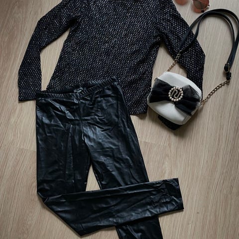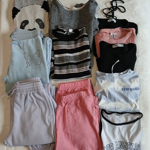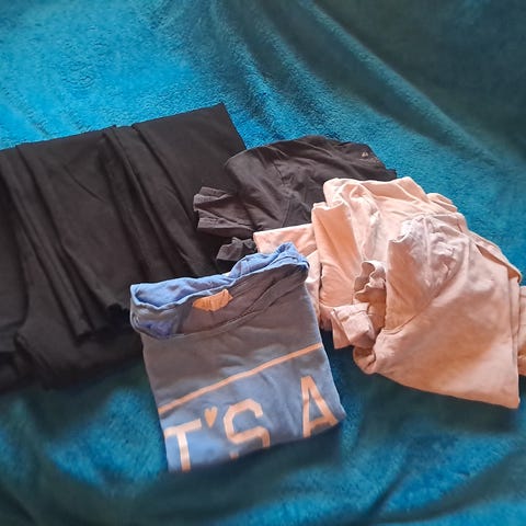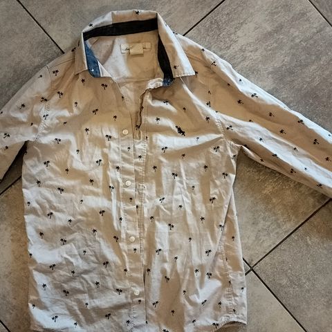 Siistit Luhdan tummansiniset housut ja mukaan kaksi kauluspaitaa, valkea 146cm ja sininen 158cm.