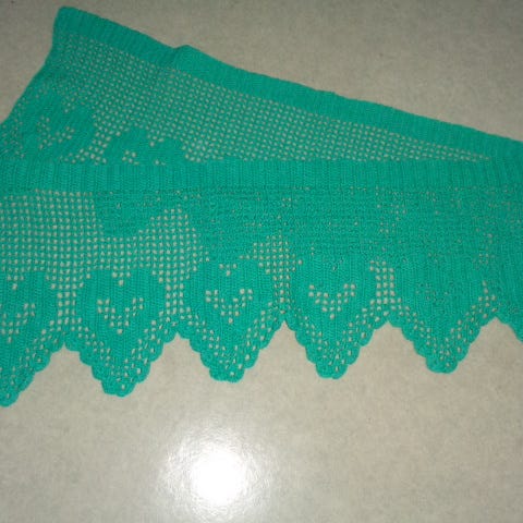 Myydään puuvillalangasta virkattu verhokappa.Valkoinen,uudenveroinen.Pituus 154 cm,leveys 30 cm.