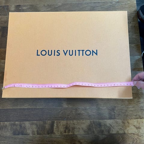 Louis Vuitton magneettilaatikko, pahvipussi, kirjekuori, silkkipaperi