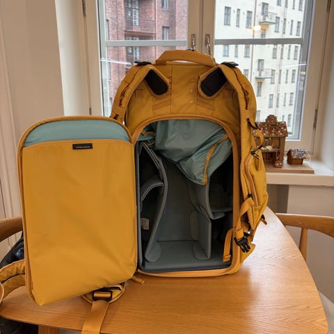 Myynnissä Shimoda Action X40 V2 -reppu, väri keltainen. Reppua on käytetty todella vähän ja käytännössä vain kameran ja kuvausvarusteiden kuljettamiseen paikasta toiseen (kesällä kuljetuksiin mökille). Ei vaelluskäyttöä tai kovaa rasitusta.