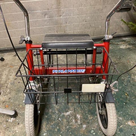 Iäkäs mutta todella vähän rullailtu Eslan potkupyörä, laakerit ja jarrut hyvässä kunnossa. Kumit pitää ilmaa mutta eivät missään tapauksessa enää uusia. Kori ja pumppu mukana