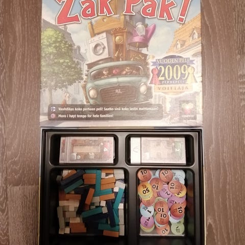 Zak Pak! -lautapeli. Peli erinomaisessa kunnossa kahta pientä asiaa lukuunottamatta. Laatikko on teipattu kahdesta nurkasta ja yksi pieni valkoinen palikka puuttuu. Muuten kaikki on tallessa.
