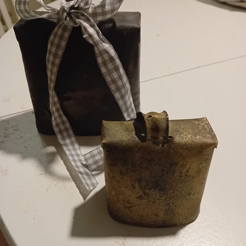 Lehmän kellot 2 kpl. Ruosteiset, helistimet sisällä. Mitat n. 11 x 12 ja 8 x 8 cm