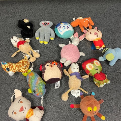 Erilaisia pehmoleluja. Eläintalous, joten kissankarvaa saattaa olla mukana.